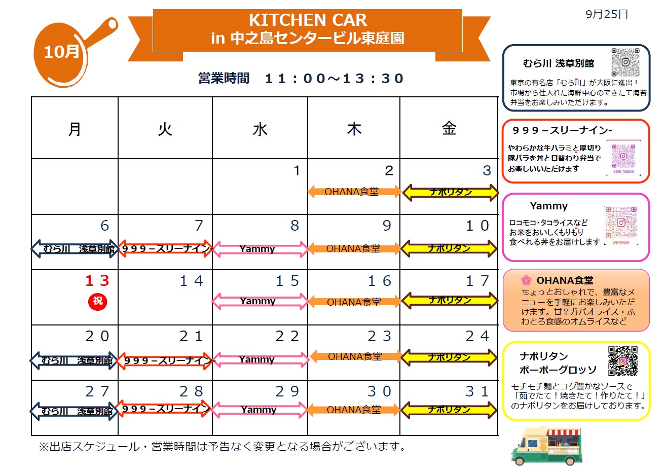 10月のキッチンカーは、下記のとおり東庭園にやってきます。