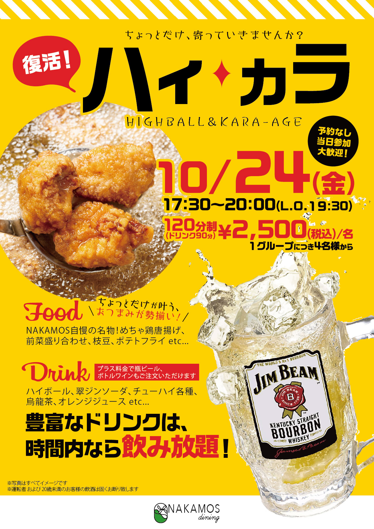10/24(金)NAKAMOSイベントのお知らせ 復活!ハイ☆カラ ハイボールと唐揚げでちょい飲みしませんか? 17:30~20:00(ラストオーダー19:30)120分制(ドリンク90分)2500円で 飲み放題! 1グループ4名様からご予約なしの当日参加大歓迎