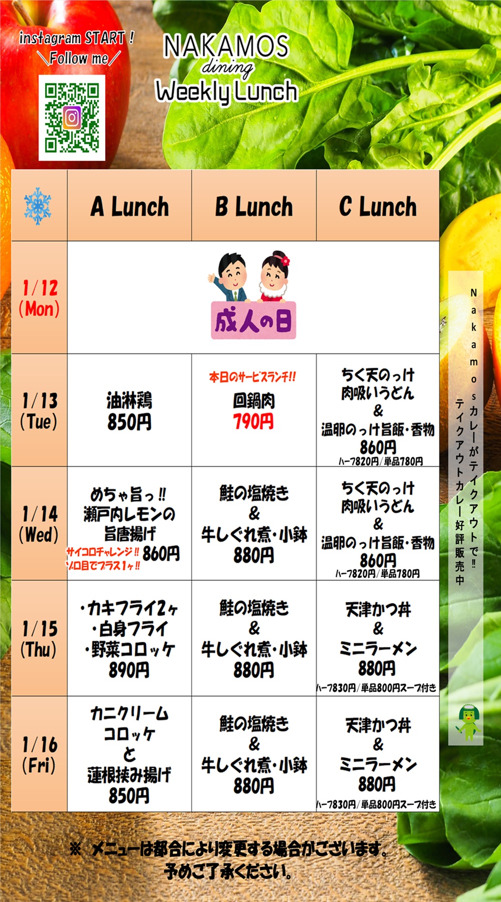 NAKAMOS dining ランチメニュー 1/13~16