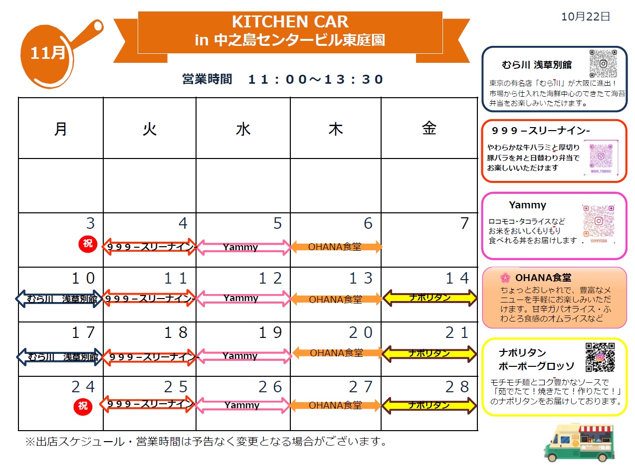 11月のキッチンカーは、下記のとおり東庭園にやってきます。