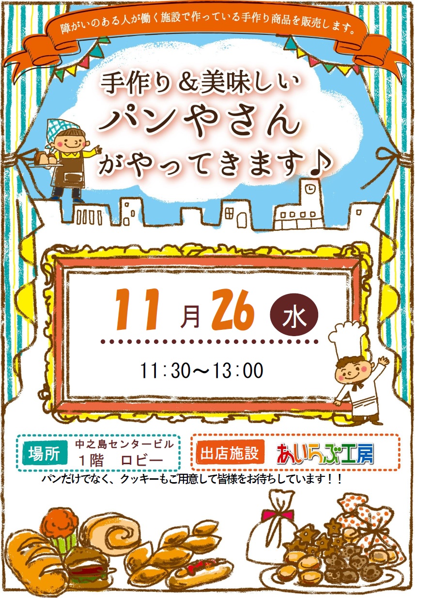 パン屋さんがやってきます(11/26) 福祉施設で生産されたパン、クッキーなどの販売を下記のとおり行います。 日時:令和7年11月26日(水)11時30分~13時 場所:中之島センタービル1階ロビー(西側) 主店・主催:あいらぶ工房・一般社団法人エル・チャレンジ福祉事業振興機構
