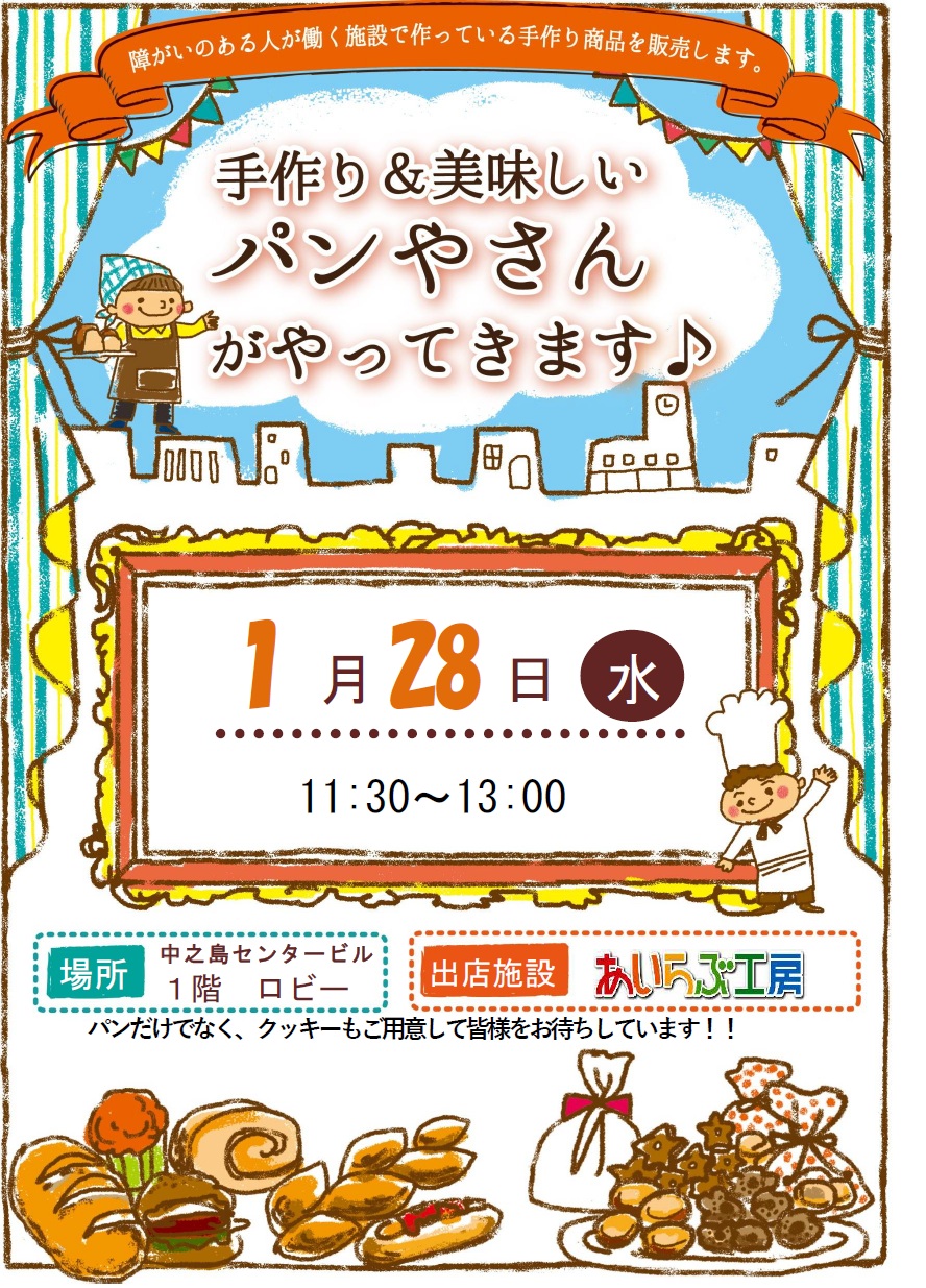パン屋さんがやってきます(1/28) 福祉施設で生産されたパン、クッキーなどの販売を下記のとおり行います。 日時:令和8年1月28日(水)11時30分~13時 場所:中之島センタービル1階ロビー(西側) 主店・主催:あいらぶ工房・一般社団法人エル・チャレンジ福祉事業振興機構