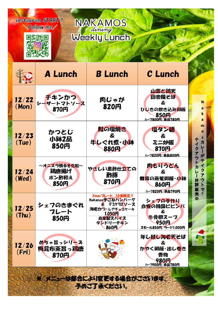 NAKAMOS dining ランチメニュ-(12/22~26)